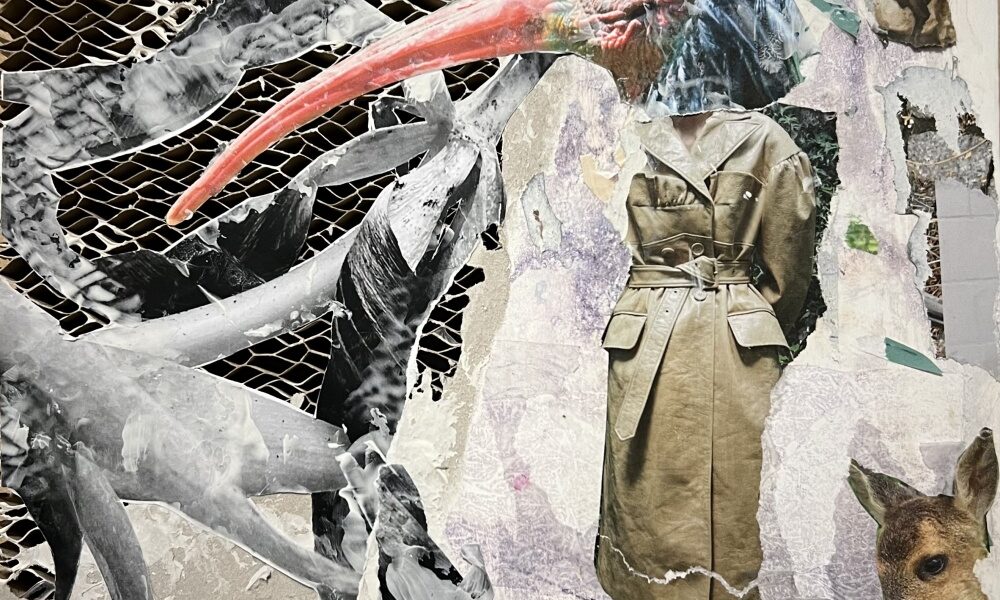 „Bei einem Collagenworkshop entdeckte ich das Bild eines Waldrapp. Dieses Tier erweckte meine Neugierde und Interesse. Ich war so fasziniert, dass ich ihm mehr Aufmerksamkeit widmen wollte. So habe ich ihn in ein Fabelwesen verwandelt und spielerisch in eine neue Welt gesetzt.